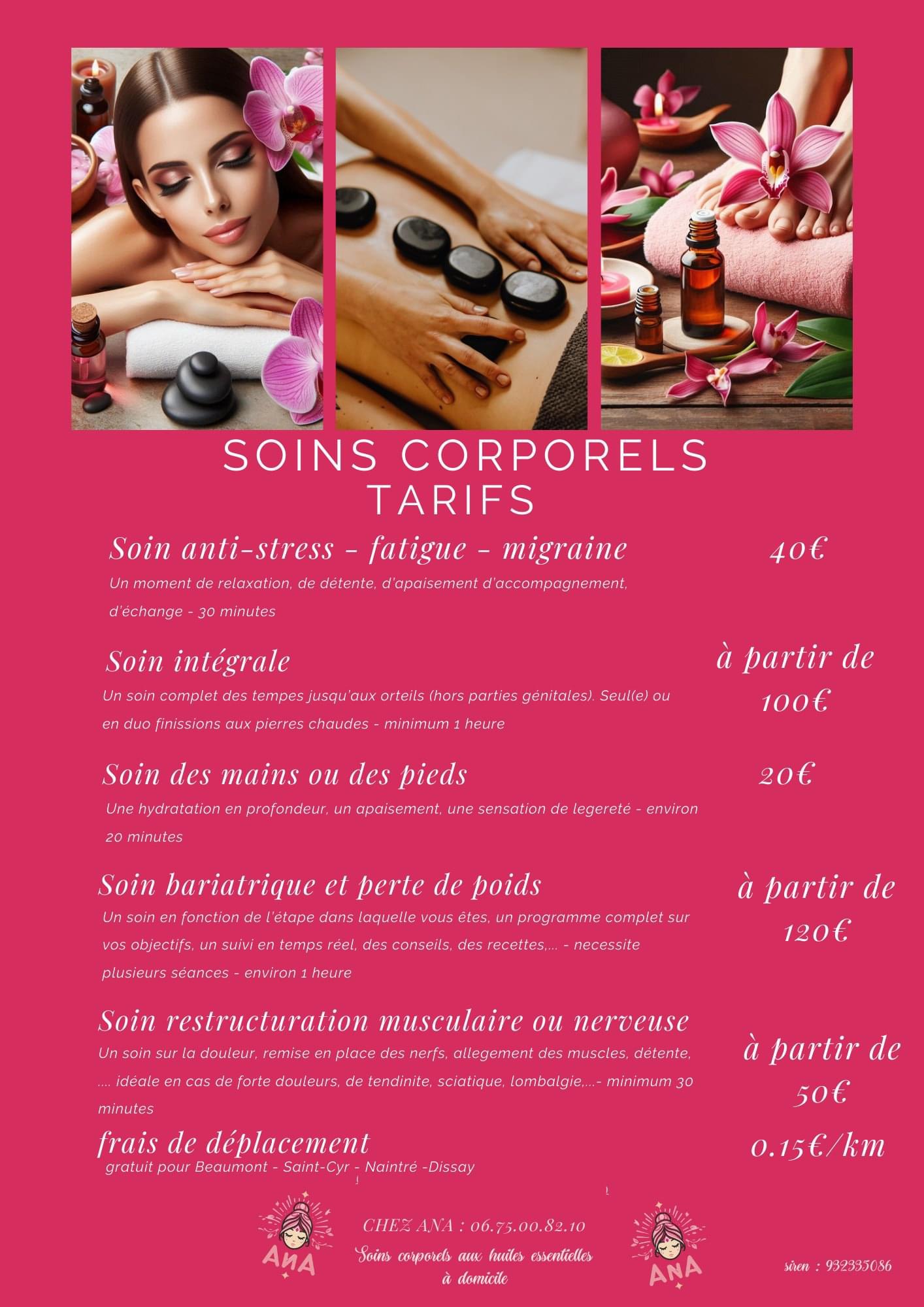 Chez Ana, l’objectif est de créer une expérience sensorielle complète, où le toucher bienveillant, les arômes des huiles essentielles et l’écoute personnalisée se combinent pour offrir un moment de relaxation profonde et de sérénité. Chaque soin est pensé pour reconnecter le corps et l’esprit, libérer les tensions et apporter un véritable moment de plaisir et de ressourcement.